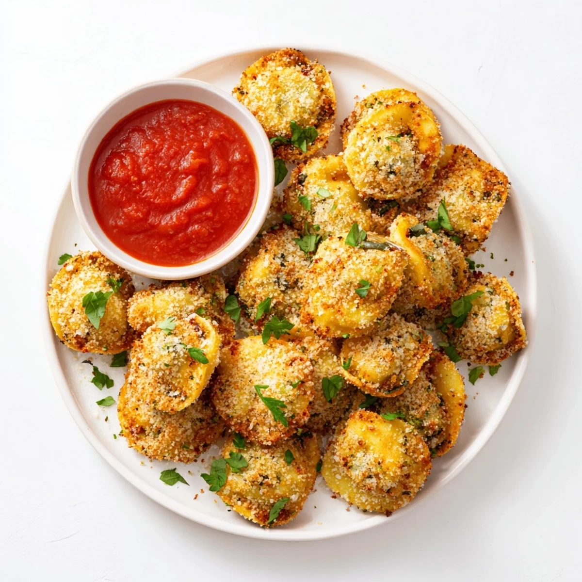 The breading station method ensures every tortellini gets evenly coated with flour, egg, and the flavorful breadcrumb mixture. Air frying creates that perfect crunch without deep frying, while shaking the basket halfway through guarantees even cooking. Serve these warm bites alongside heated marinara sauce for dipping, and garnish with fresh basil or parsley for a pop of color.