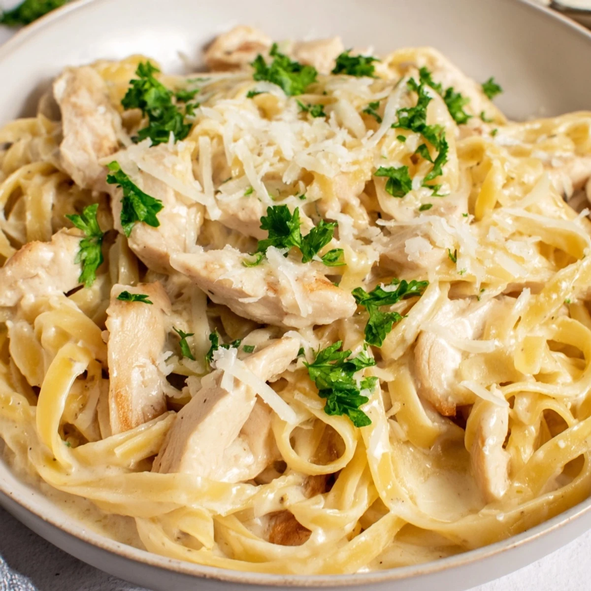 - Fold in the sliced chicken and top with parsley and extra Parmesan while it is hot.