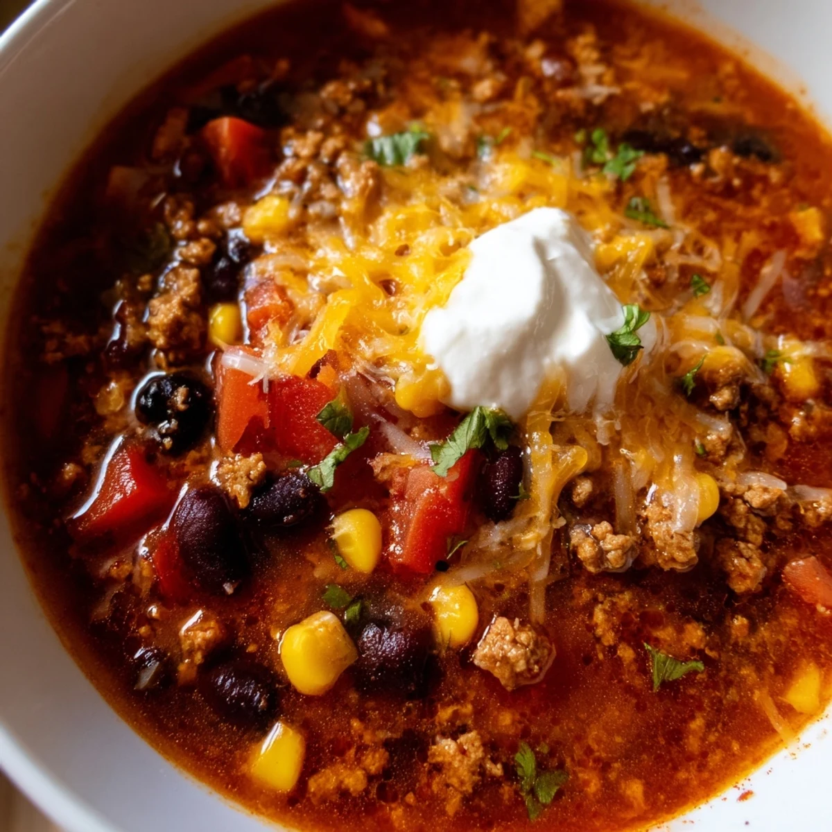This comforting soup combines seasoned ground beef with black beans, kidney beans, corn, and tomatoes, all simmered together in a rich beef broth infused with taco spices. The slow cooker does all the work, developing deep flavors over 6 hours while you focus on other things. Perfect for meal prep, leftovers keep beautifully in the fridge or freezer. Customize with your favorite toppings like shredded cheese, sour cream, cilantro, or tortilla chips for a complete, satisfying meal any night of the week.