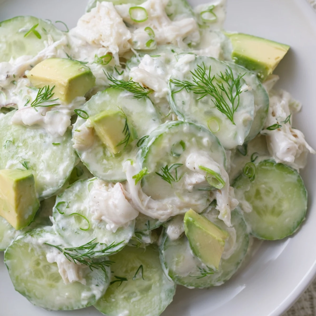 This elegant dish combines thinly sliced crisp cucumbers with succulent sweet crab meat, all tossed in a creamy tangy dressing made with mayonnaise, sour cream, and fresh lemon juice. The preparation comes together in just 15 minutes with no cooking required—simply slice, whisk the dressing, and gently fold everything together. Fresh dill and lemon wedges add bright finishing touches that complement the delicate sweetness of the crab.