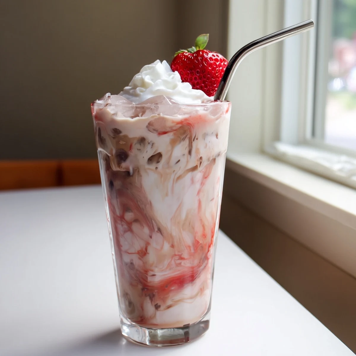 The sweet-tart strawberry base balances perfectly with rich dairy and bold coffee, creating a sophisticated layered drink. Adjust sweetness to your taste and top with whipped cream for an indulgent treat.